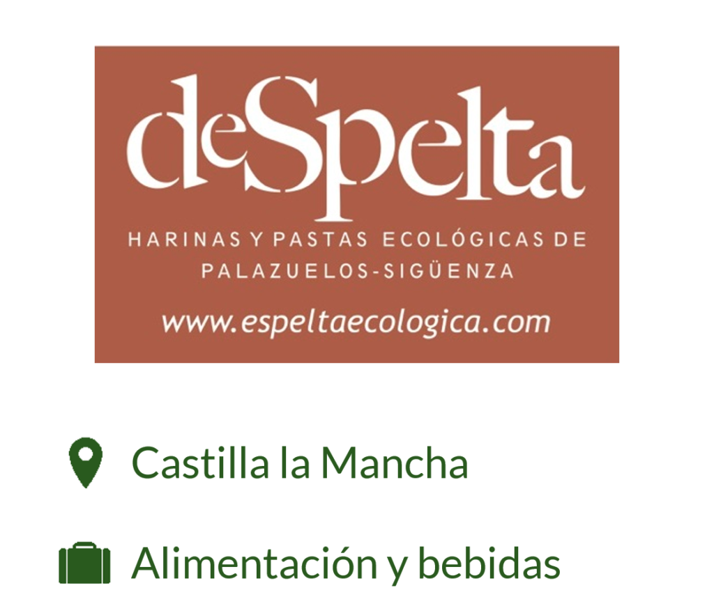 Facebook Linkedin Instagram despelta.com Palazuelos, Guadalajara, Castilla la Mancha Alimentación y bebidas DeSpelta es una empresa que trasforma principalmente los cereales de la explotación agrícola ecológica de Francisco Juberías en las vegas de Palazuelos (Sigüenza), en harinas y pastas ecológicas. Todos los trigos que utilizamos son antiguos y las harinas son molturadas engrano entero en […]
