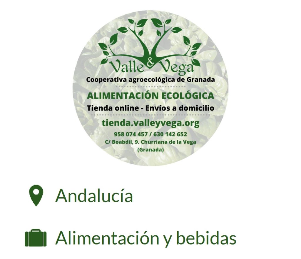 Facebook Linkedin Instagram valleyvega.org Churriana de la Vega, Granada, Andalucía Alimentación y bebidas Nos dedicamos a la producción y comercialización de frutas, verduras, panadería, aceite y otros productos de alimentación ecológica. En Valle y Vega mantenemos el comercio de cercanía como una forma de transformación social y ambiental de nuestro territorio. Disponemos de una nave […]